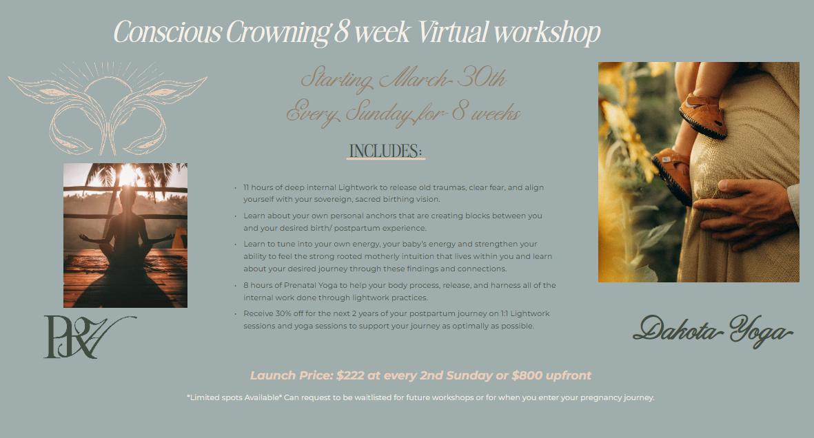 An 8 week program working to prepare your mind, body, and heart, through lightwork and prenatal yoga. Release un-useful turmoil that is creating fear or blocking you from your desired birth and postpartum experience. Lets work together to strengthen your natural innate connection to lead you to not only the sovereign and empowering birth that you are envisioning, but also the most fulfilling motherhood journey that emulates the nurturing, calm, confident, intuitive, divinely influential mother that your inner child’s heart has always been asking for, the one you are striving to become. Learn an array of techniques from a blend of modalities including lightwork, meditation, reflexology, hypnosis and general holistic knowledge to keep yourself grounded and clear through the waves of pregnancy, birth and eternal postpartum, all while remembering your divine feminine connection.